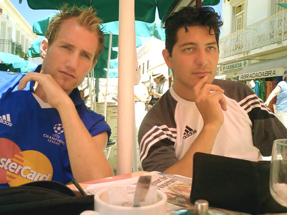 Chrigu und Mänu informieren sich während einem Kafi-Ausflug im Städtchen übers
