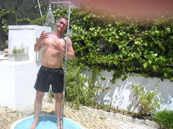 Wie es sich für Saubermänner gehört, wird vor dem Sprung in den Pool geduscht!