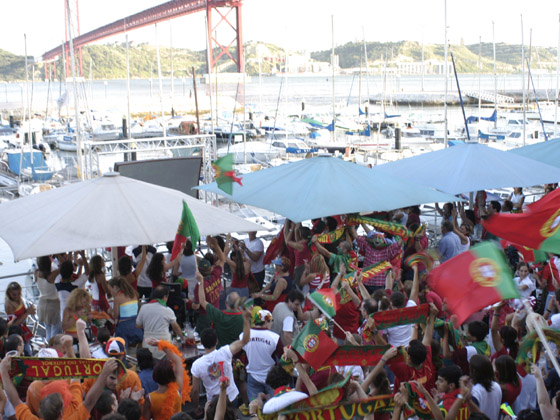 | Am letzten Abend begaben wir uns an die Nachtmeile am Hafen unter dem Ponte Abril, wo sich tausende von Fussballfans auf eine rauschende Nacht einstellten! Wenn nur die Griechen die Party nicht versaut hätten... |